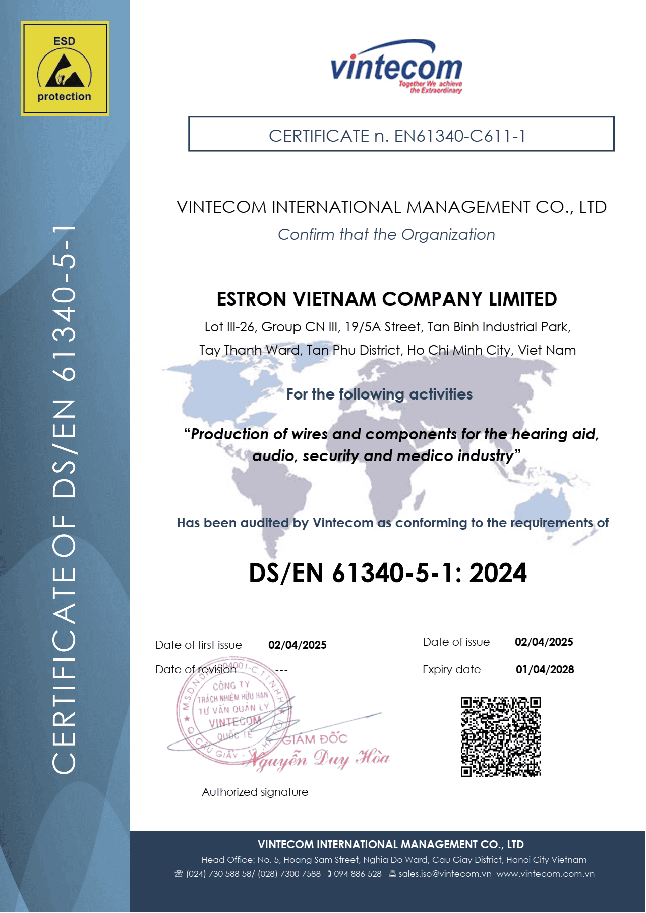 Chứng chỉ DS/EN 61340-5-1: 2024 - Công ty TNHH Estron Việt Nam